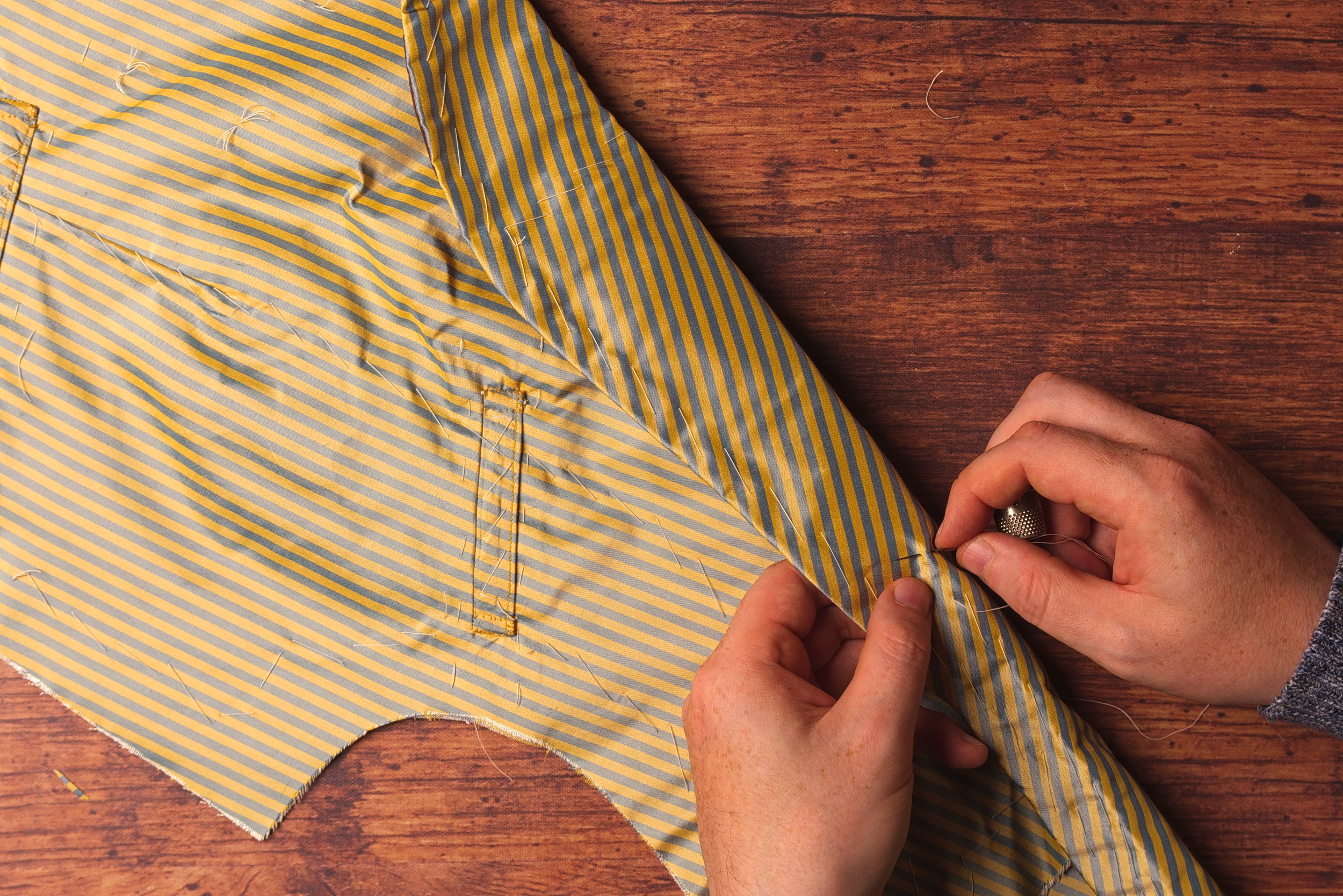 Let’s prepare the facing now in order to install it into the waistcoat. Begin by basting the two sections of the facing together at the bottom, right sides together. It’s easy to lose track of which way is which with the smaller bottom section, so compare it to your pattern to make sure it’s going…