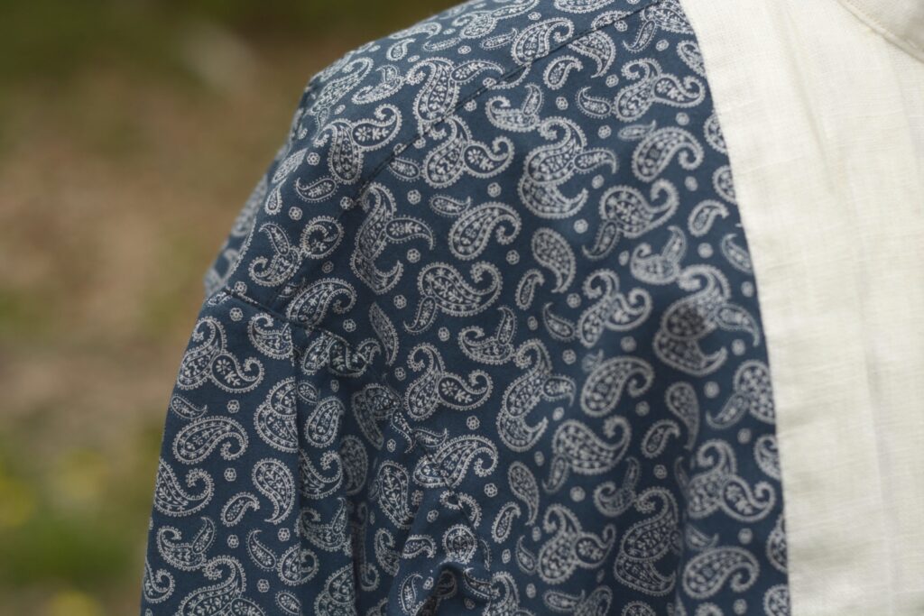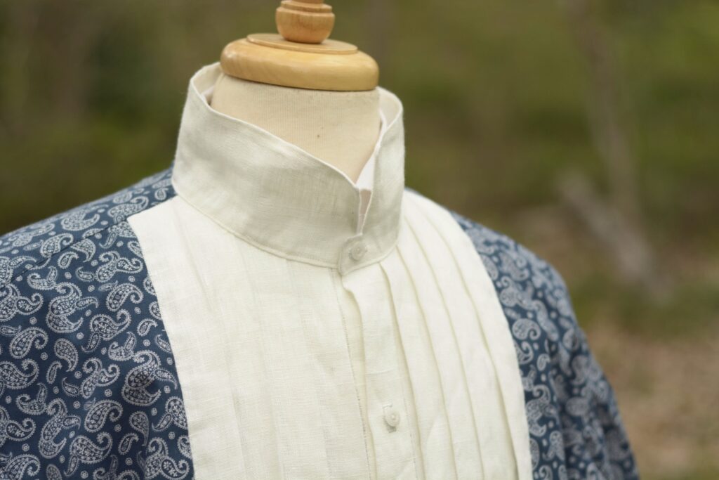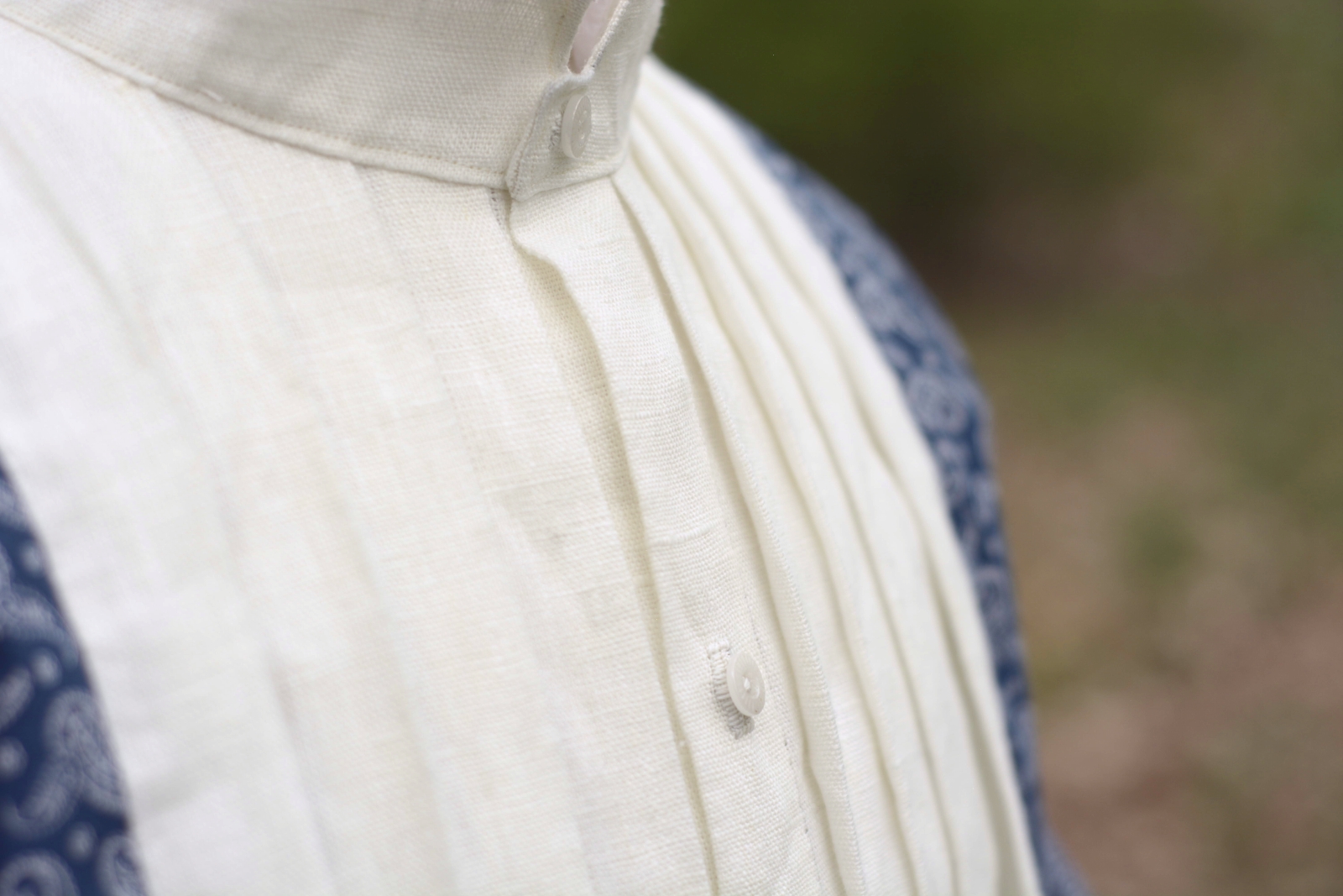 The shirt can be constructed in a couple of different ways. 1) 100% linen which is very cool but slightly more expensive. Also more uncomfortable while the shirt is breaking in. 2) 100% cotton. Prints in small repeating patterns are best. Most affordable and comfortable, good for lower class impressions. 3) A mix of both cotton print and linen for the cuffs, collar, and pleated front, which is what I’ll be doing. Best of both worlds in that it is affordable, comfortable and slightly more formal than the cotton variation.