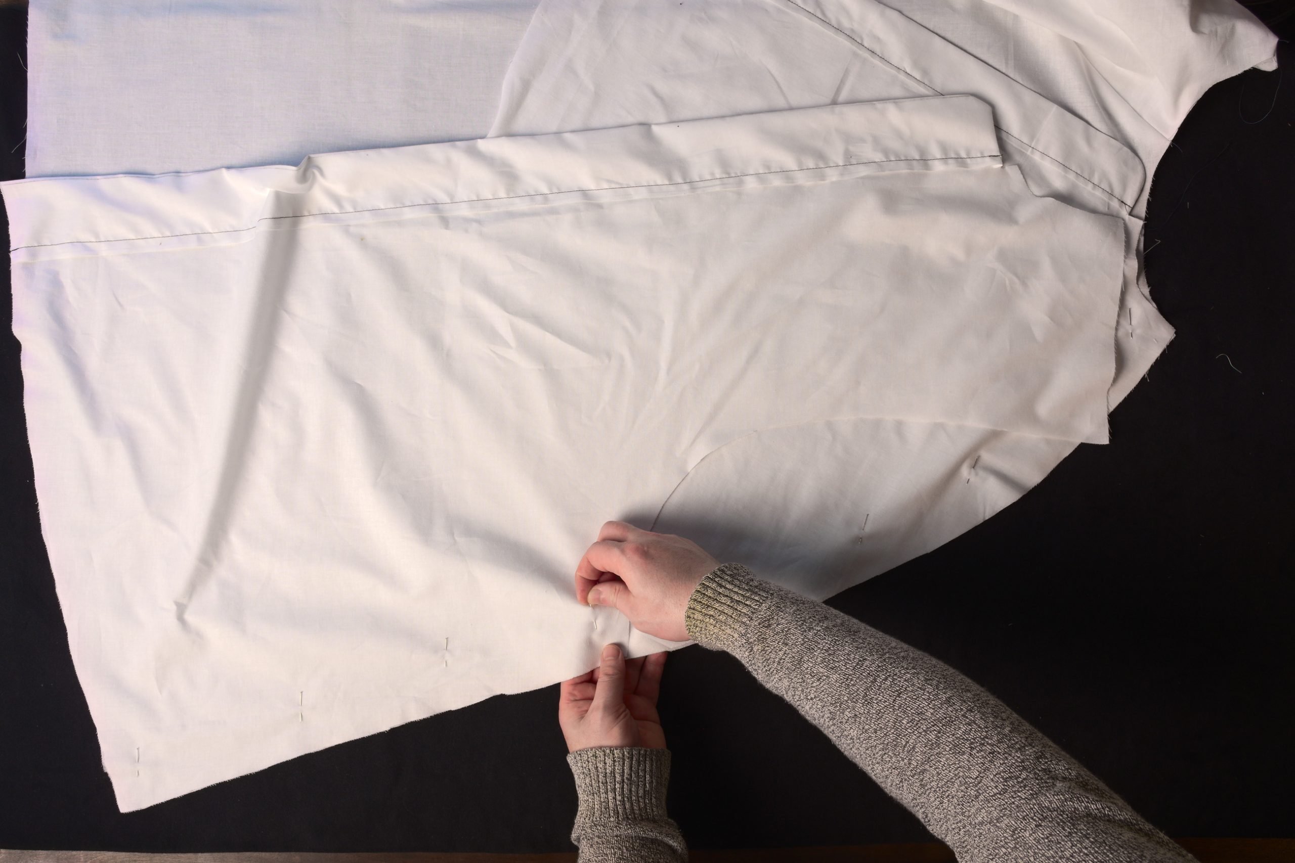 The Inverness Cape can seem quite confusing at first as to how all the pieces go together, but assembling the pieces of the cape body is actually pretty straightforward. Begin by laying out the back piece, unfolded, right side up on the table. Lay the appropriate cape on top, right sides together. The neck seam…